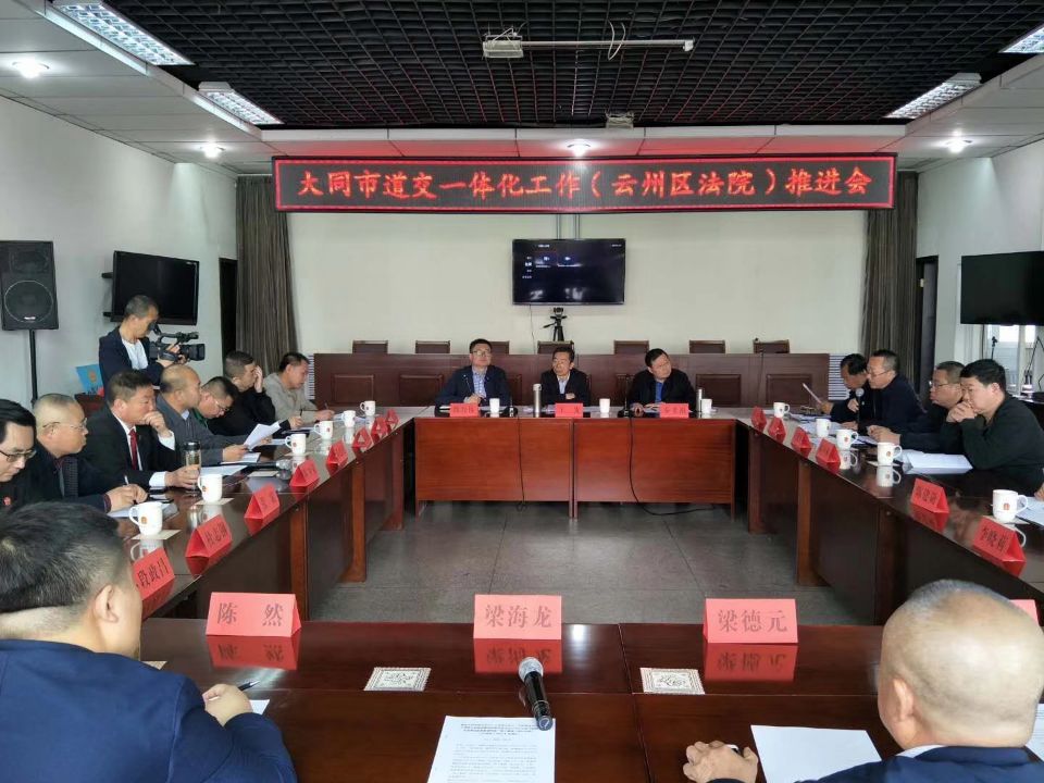 为进一步落实最高人民法院办公厅、公安部办公厅、司法部办公厅、中国银行保险监督管理委员会办公厅关于印发《道路交通事故损害赔偿纠纷“网上数据一体化处理”工作规范》的通知[2018]163号文件精神,2019年4月29日在大同市云州区法院会议室召开大同市道交一体化(云州区法院)推进会,会议由云州区法院院长邵晋栋主持,参加会议的有大同市中级人民法院常务副院长王发、云州区政法委书记乔来福、市区公安交警、司法局、法院以及区人保财险、平安财险、中煤财险领导参加会议,大同市保险行业秘书长郭促、调委会贺启宗、陈建勋、李晓莉应邀参加会议。王发常务副院长做项目跟踪责任到人限时启动的重要讲话。郭促秘书长结合当前工作现状,提出网上网下同时并举,政府主导积极配合,先行先试项目突破工作建议。