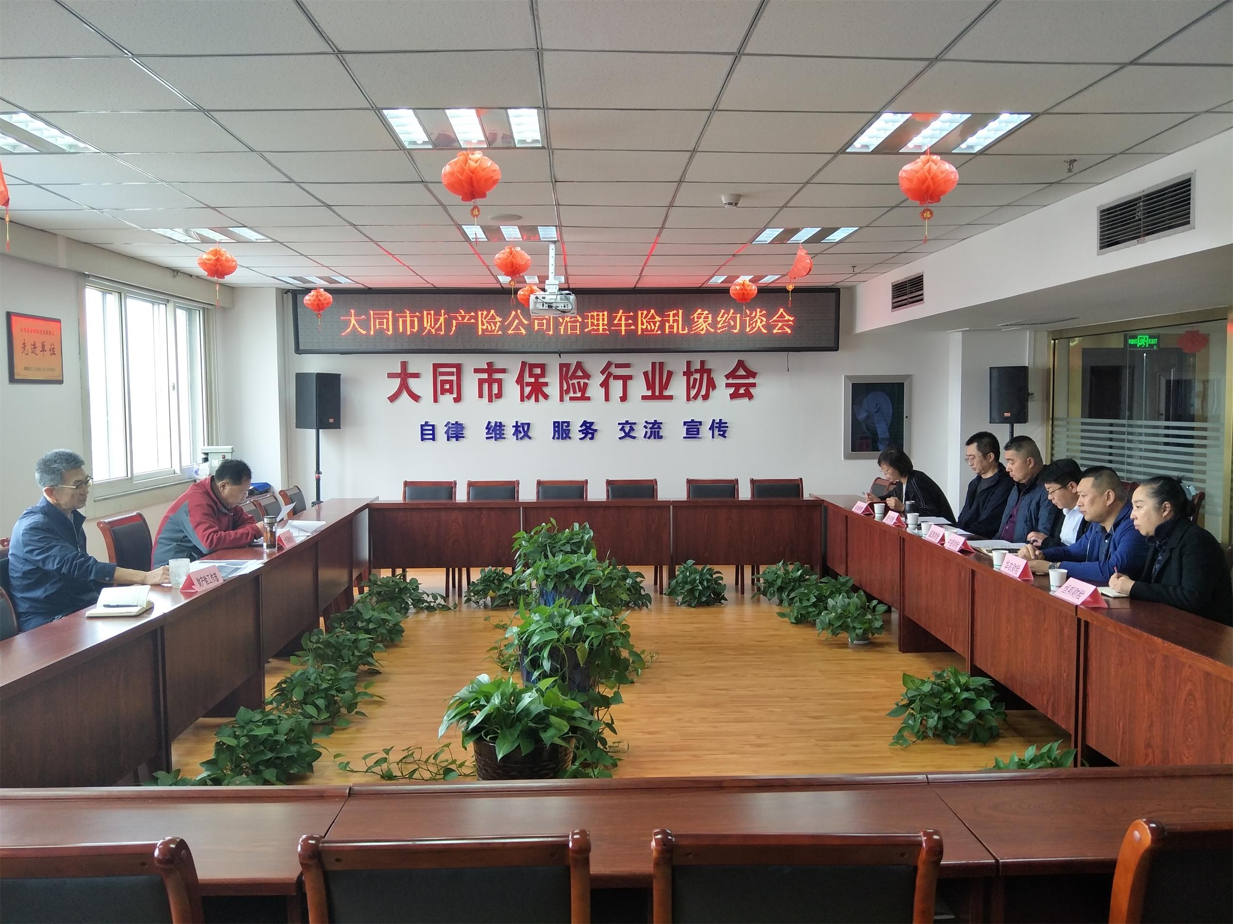 2019年10月24日在协会会议室,大同市保险行业协会召开大同市财产险公司治理车险乱象约谈会。安邦财险、中银财险、国任财险、诚泰财险四家财险公司总经理,华农财产山西分公司综合部负责人、恒邦保险代理公司负责人及协会财产险部工作人员参加本次会议。会议由协会秘书长郭促主持。