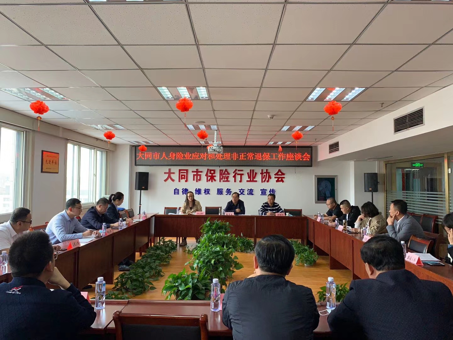 2020年5月26日下午,大同市保险行业协会召开了大同市人身险业应对和处理非正常退保工作座谈会。大同银保监分局消保科科长闫安忠、保险监管科张艳丽出席本次座谈会。协会人身险部和综合办公室以及中国人寿、太平洋人寿、平安人寿等11家人身险会员公司总经理、分管副总及部门负责人参加了会议,会议由协会秘书长郭促主持。