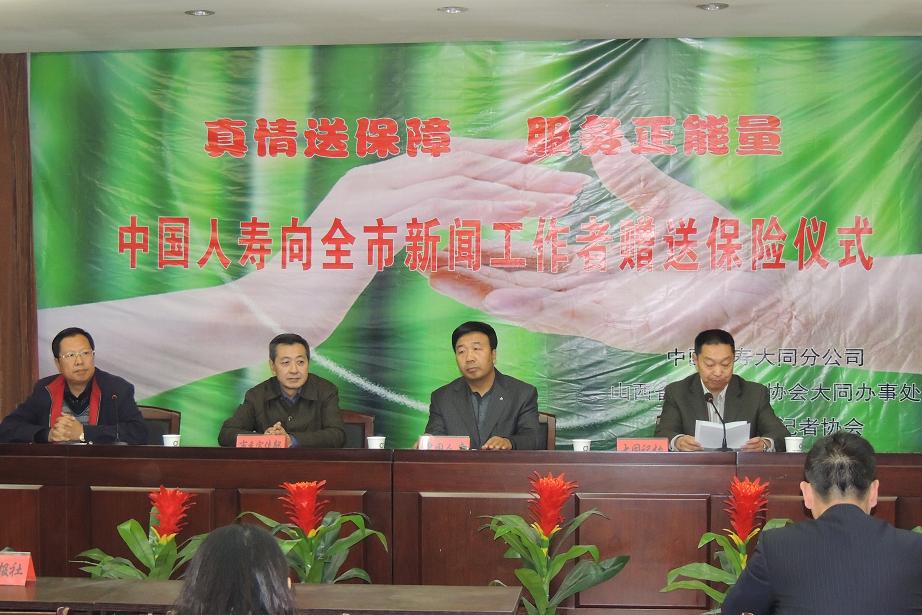 为增进大同保险业与新闻媒体的沟通交流,树立保险业的良好社会形象,扩大保险业在新闻媒体以及广大保险消费者中的影响,在山西省保险行业协会大同办事处、大同市新闻工作者协会积极推动下,中国人寿大同分公司向全市800多名新闻工作者,每人赠送了保额为1.2万元的意外伤害保险,并于11月5日举行了主题为“真情送保障,服务正能量”的“赠送保险仪式”活动。大同市委宣传部副部长李文忠、大同市新闻工作者协会负责人张晓非、中国人寿大同分公司副总经理王坚以及省、市十一家新闻媒体相关人员、28家会员公司主管宣传工作负责人等60多人参加了此次活动,大同办事处主任郭促主持了此次活动。