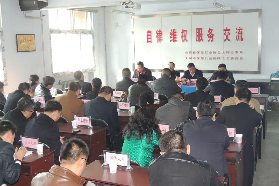 2014年3月13日,大同办事处组织召开了大同市自律工作委员会2014年第一次会议。大同市自律工作委员会会长、人保财险大同分公司总经理王俊斌及其他28家会员公司总经理参加了会议。大同市金融办公室主任王四祯参加了会议,并在会上作了讲话。会议由大同市自律工作委员会副会长、中国人寿大同分公司总经理郭善宏主持。