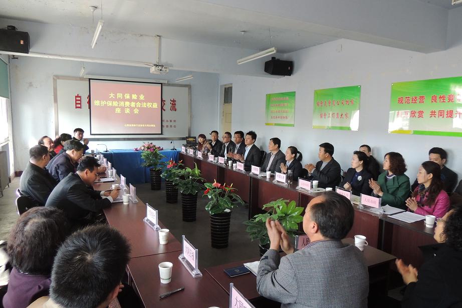 2014年3月14日,大同办事处召开了“大同保险业维护保险消费合法权益座谈会”。作为2014年度“3.15”宣传活动的重要组成部分,大同办事处邀请了大同市金融办公室、人民银行大同中心支行、大同市工商局、大同市消费者协会、大同市新闻工作者协会的主要领导、大同市保险纠纷人民调解委员会的两名律师调解员以及新浪网、大同电视台、大同日报、大同晚报等主要媒体记者,全市14家产、寿险会员公司主管理赔、客服工作的副总经理,共计30余人参加了座谈会。会议由大同办事处主任郭促主持。