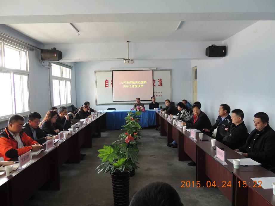 4月24日,大同办事处组织召开了“大同市保险诉讼案件调研工作座谈会”。大同市中级人民法院民事审判二庭邵晋栋庭长、马卉妍副庭长,大同市司法局司法鉴定处霍秀华副处长,大同市交警支队事故处李冬青处长、事故大队王连挺队长、张晓东副队长,大同市城区人民法院综合办张文斌主任以及人保财险大同分公司、中国人寿大同分公司等11家保费规模较大的保险公司分管副总经理共计27人参加了会议。会议围绕大同市保险诉讼案件调研及“诉调对接”推进进行了热烈的座谈交流,会议由大同办事处主任郭促主持。
