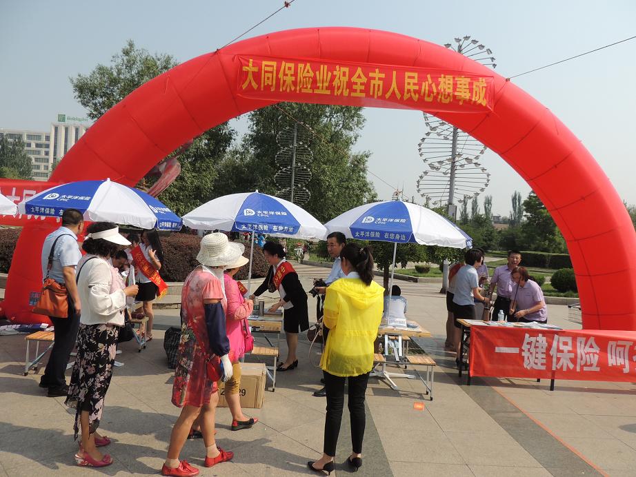 7月8日上午,山西省保险行业协会大同办事处组织全市31家会员公司在大同市迎宾广场开展了大型宣传活动。该活动是大同保险业“7•8全国保险公众宣传日”主题系列活动之一。活动现场,各家保险公司通过发放特色宣传彩页、摆设咨询台、赠送小礼品、推广微信平台等方式,向社会公众广泛宣传保险知识,并就有关保险消费话题分别与闻讯而来的众多市民进行了交流,现场人声鼎沸,气氛热烈。