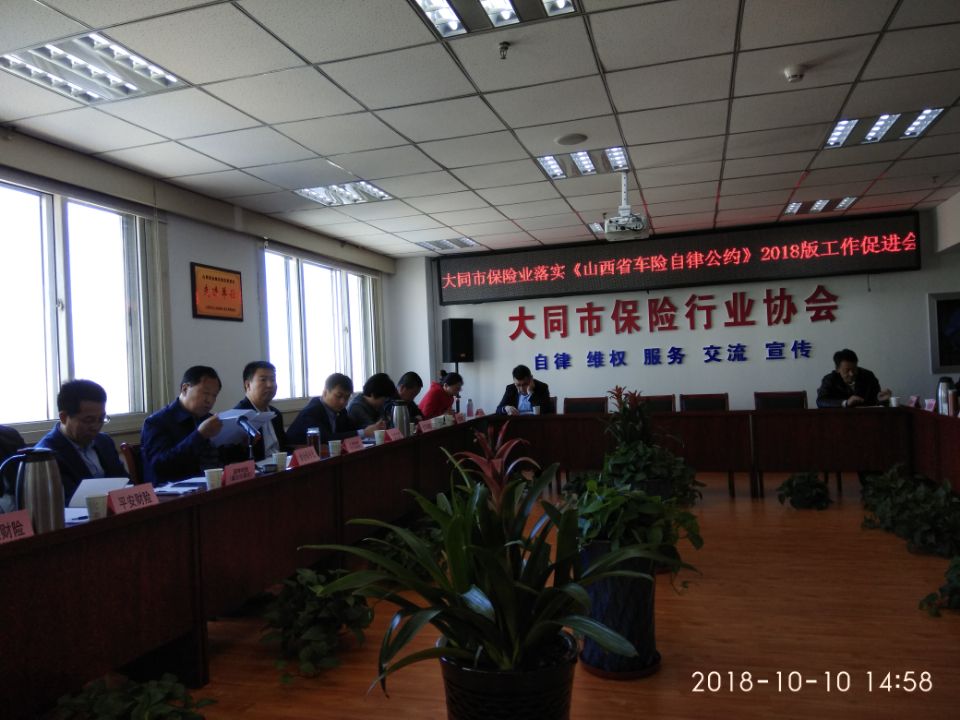 为进一步维护大同市机动车辆保险市场秩序,促进行业健康稳定发展,切实保护保险消费者合法权益,落 实上级监管规定和行业公约,依法合规经营车险业务,大同市保险行业协会于2018年10月10日下午2:30在大同市保险行业协会会议召开大同市保险业落实《山西省车险自律公约》2018版工作促进会,全市23家财产险会员公司总经理及其分管副总经理,行业协会财产险部、综合办公室相关人员共31人参加了会议,会议由协会秘书长郭促主持。根据会议议程,财产险部主任陈建勋宣导中国银保监会《关于切实加强和改进保险服务的通知》银保监发〔2018〕40号文件,郭促秘书长组织大家学习《山西省车险自律公约》(2018版),宣读《大同市车险自律公约》草拟稿,全体会员公司总经理及其代表表示坚决遵守监管规定,一致表决通过《大同市车险自律公约》,并共同签署了《大同市财产险会员公司车险业务自律合规承诺书》。